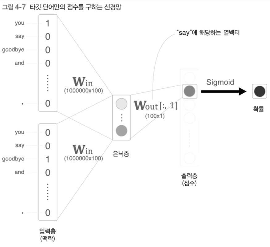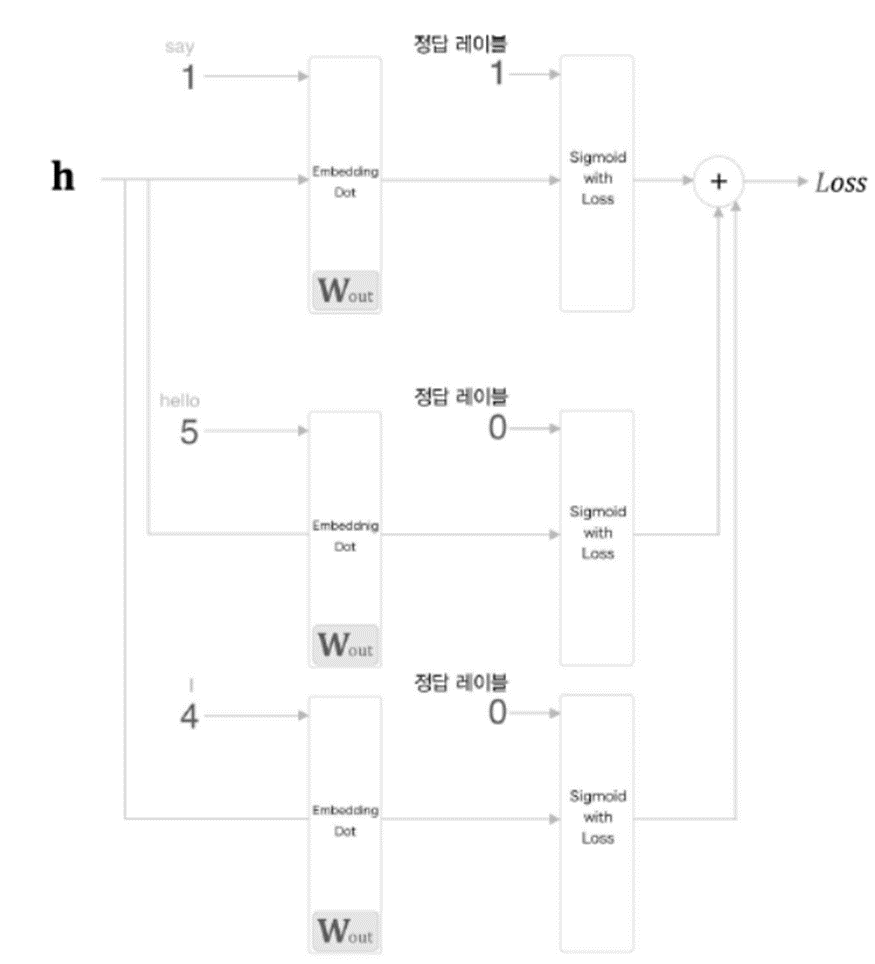 단어 ID는 you: 0, say: 1, goodbye: 2 라고 가정하고 임베딩 계층에서 단어 ID의 분산표현을 추출하고 은닉층 뉴런 h와 출력층의 가중치 Wout에서 단어 'say에 해당하는 column을 추출해서 해당하는 단어 벡터와의 내적을 계산한다. 그리고 그 출력을 시그모이드 계층에 입력해 최종 손실을 얻는다.